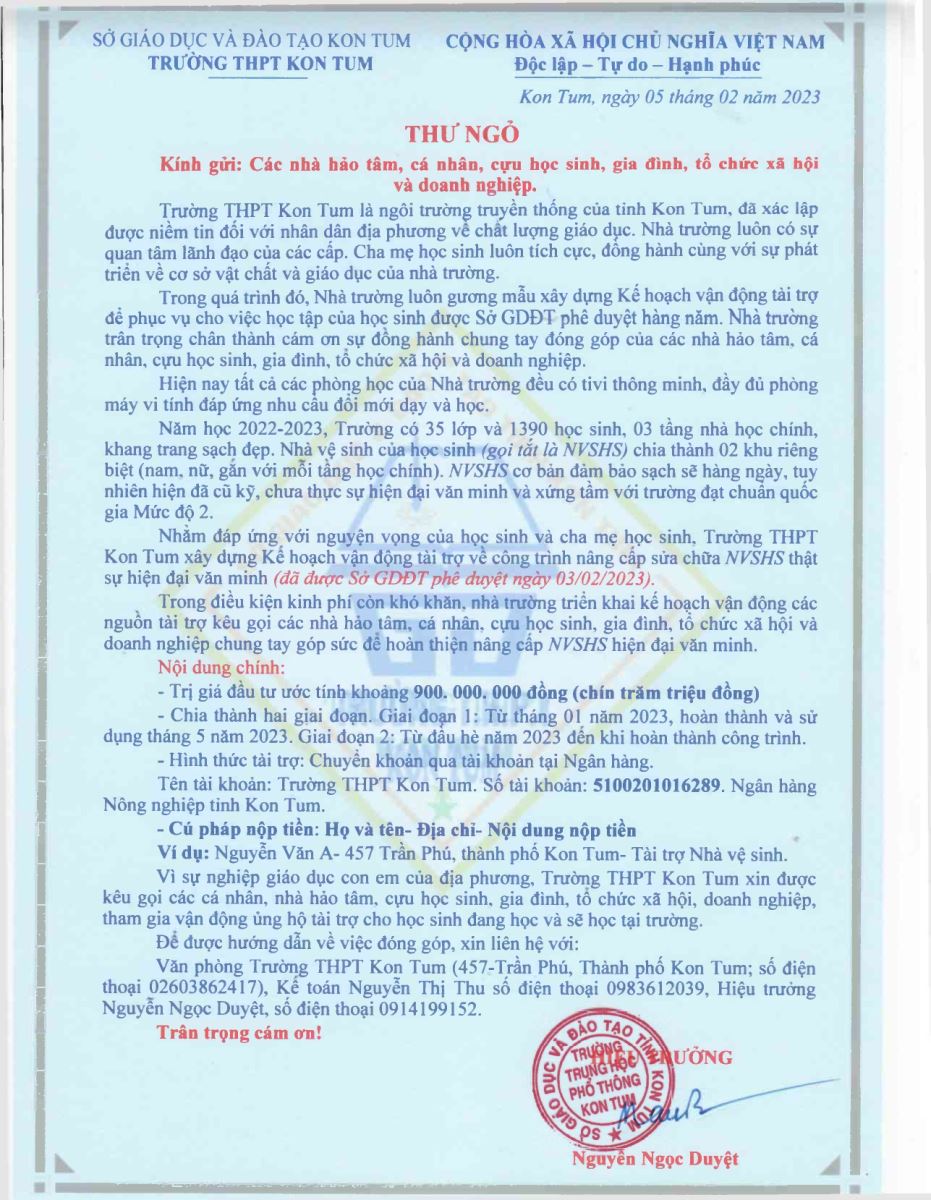 THƯ NGỎ VẬN ĐỘNG TÀI TRỢ NĂM HỌC 2022 - 2023